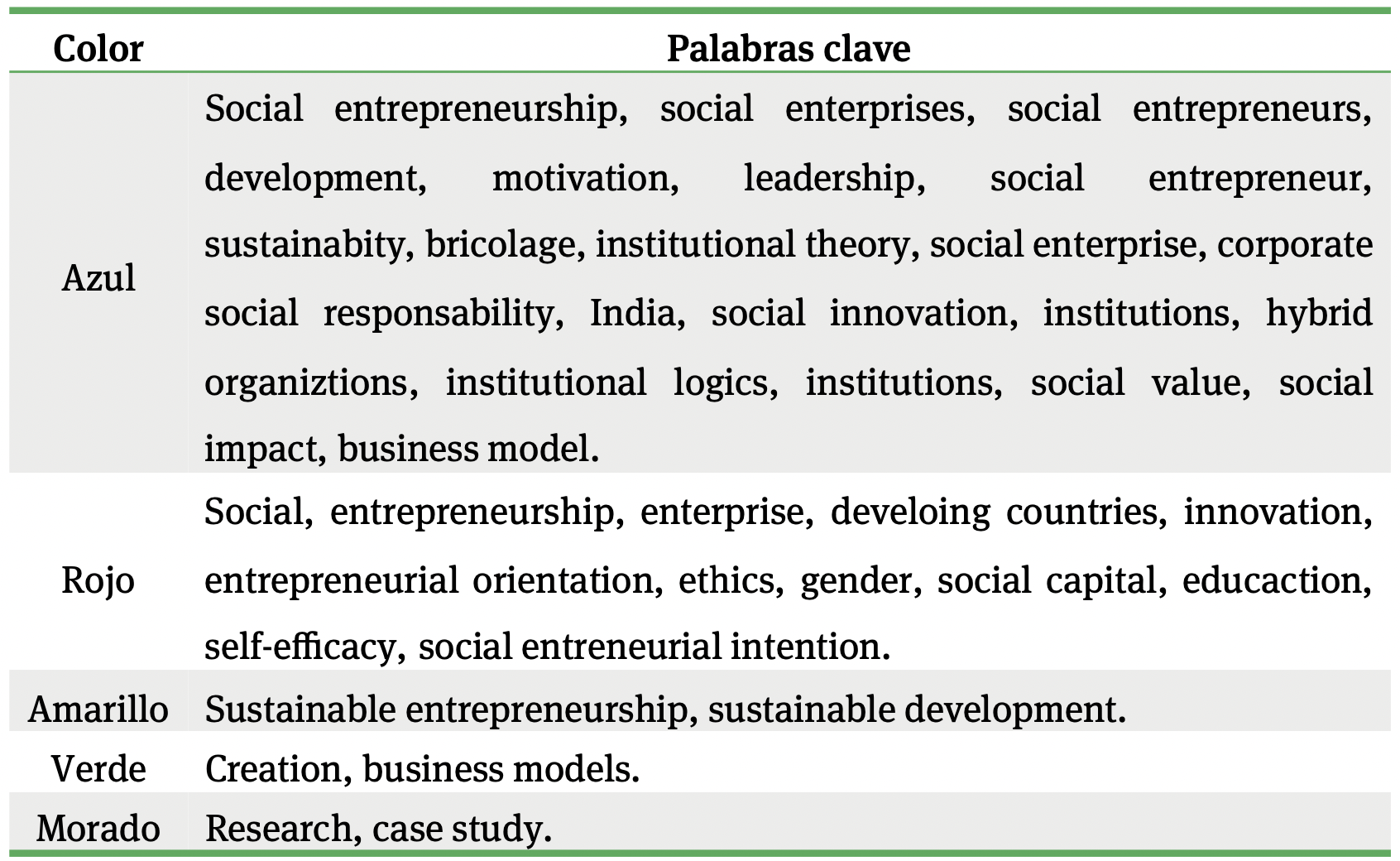 En la tabla 3 se especifican por color las categorías de palabras clave que se utilizan en la literatura del emprendimiento social, con el objeto de identificar las interconexiones en los diversos artículos científicos que integran el análisis bibliométrico realizado (figura 3).