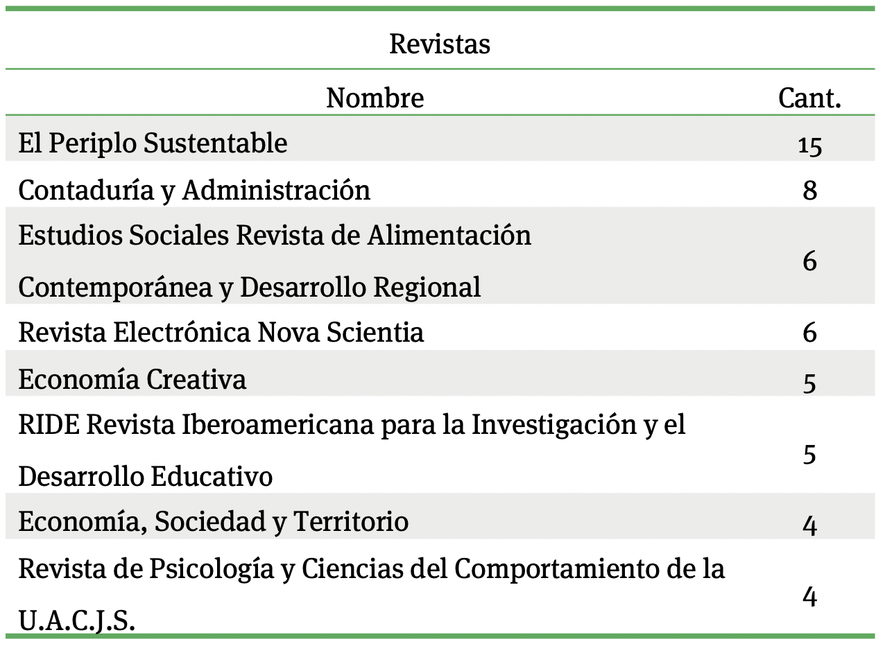 En México, las revistas con más publicaciones sobre la temática de es son El Periplo Sustentable (15 publicaciones) y Estudios Sociales: Revista de Alimentación Contemporánea y Desarrollo Regional (6 publicaciones), considerando que la revista de Contaduría y Administración (Scopus) tiene 8 publicaciones sobre el emprendimiento, únicamente dos de dichos artículos son específicamente sobre es; con esto, se denota una debilidad en México sobre la proyección del es en las ciencias administrativas, debido a que las primeras revistas mencionadas son multidisciplinarias, y son éstas quienes abordan al es como una opción para solucionar problemas sociales, siendo en su mayoría casos de estudio confirmando la tendencia a nivel internacional.