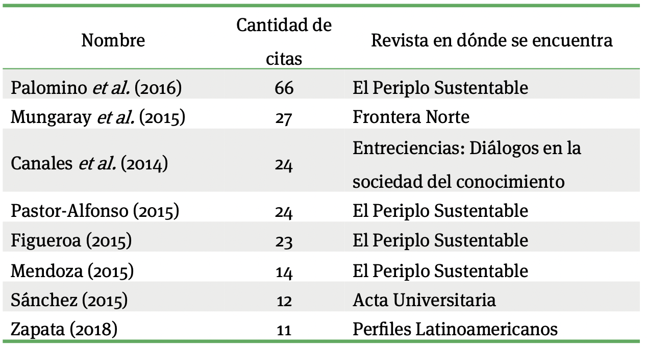 La tabla 5 ilustra los principales autores por número de citas, siendo Palomino et al. (2016) con 66 citas el más referenciado. La revista El Periplo Sustentable publicó 4 de los artículos más citados sobre es en el crmcyt (Conacyt, 2016).