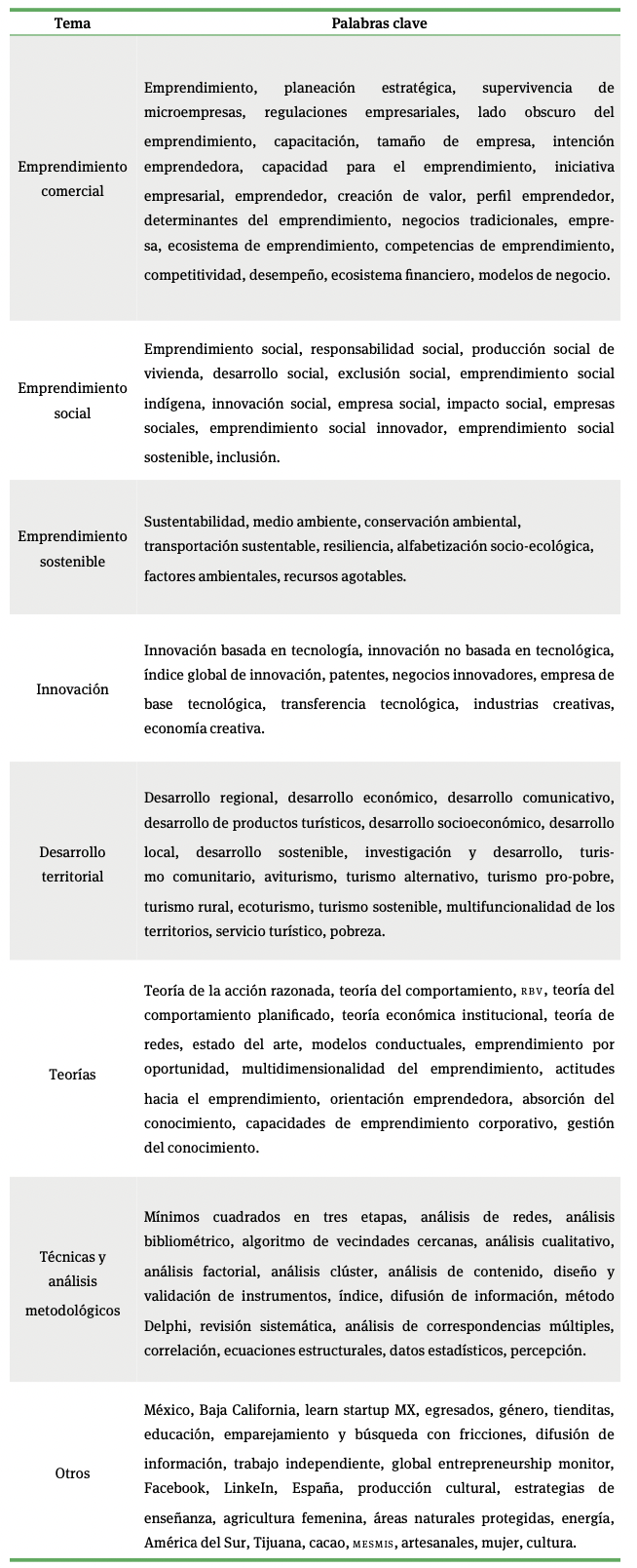 Tal y como se expone en la tabla 6, la cantidad de palabras clave es muy divergente y dispersa, aun así, se realiza un análisis, donde se destaca que el emprendimiento social y el emprendimiento sostenible son temas que poseen la menor cantidad de palabras clave, mientras emprendimiento clásico y desarrollo territorial son abordados por cualquier temática.