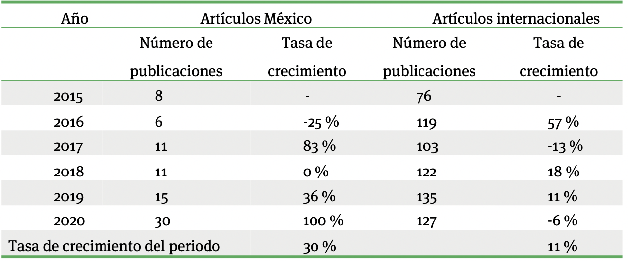 Fuente: elaboración propia con datos obtenidos en Web of Science (Clarivate, 2021) y crmcyt (Conacyt, 2016)Para profundizar en el desarrollo de las publicaciones se obtuvo la tasa de crecimiento de las publicaciones científicas, tanto de manera internacional como para México. De tal manera que en la tabla 7 se presenta un análisis comparativo de los indicadores de producción sobre es.