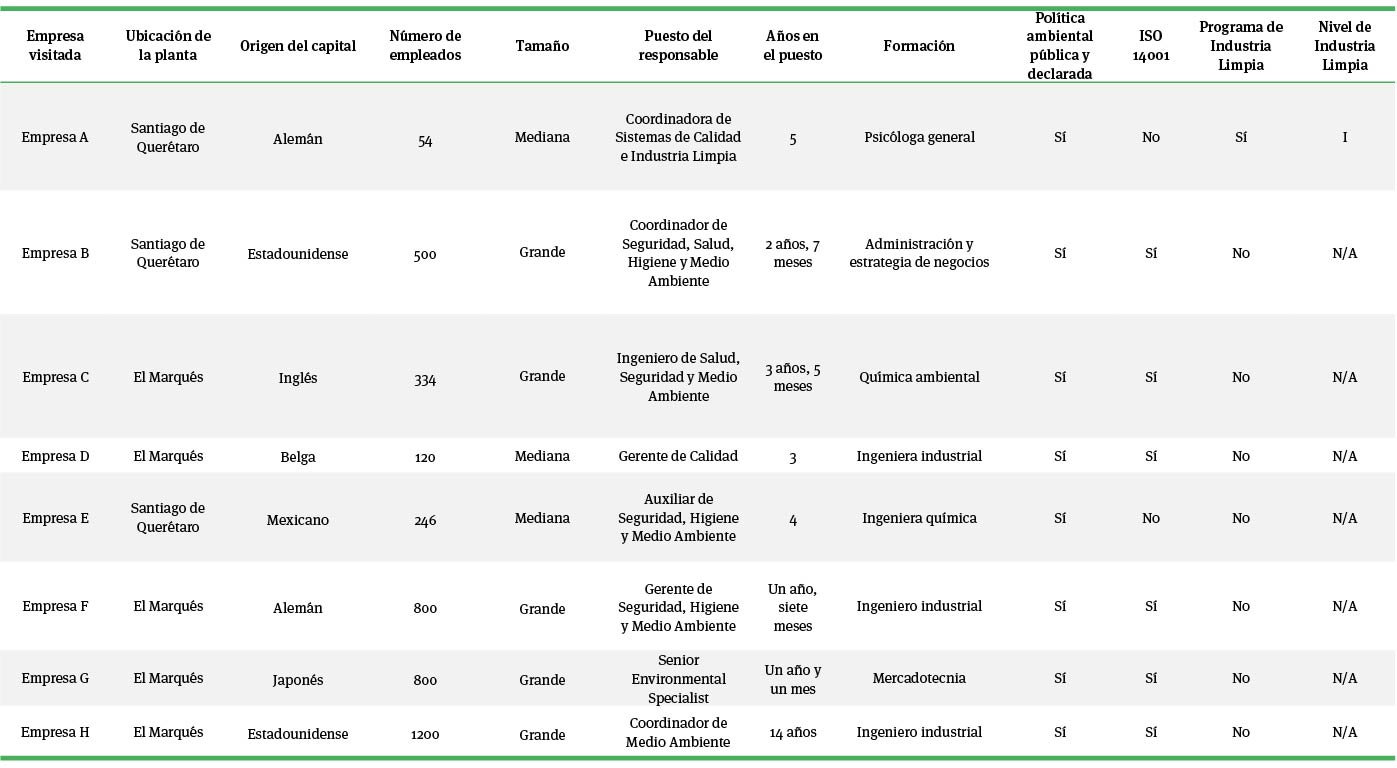 Se consideraron ocho plantas del sector autopartes ubicadas en los municipios de Santiago de Querétaro y El Marqués (en el estado de Querétaro, México) (ver tabla 1). Siete empresas visitadas son de capital trasnacional (87.5%) con una organización tipo comando control con directiva externa, y una local (12.5%); 37.5% son empresas medianas (n=3) y 62.5% grandes (n=5). Las ocho tienen una media en el número de empleados de 507 (Desviación Típica 397), todas cuentan con política ambiental pública y declarada; siete tienen implantado un sistema de gestión ambiental; seis cuentan con un certificado bajo la norma ISO 14001, mientras que solamente una participa en el nivel I, dentro del Programa de Auditoría Ambiental de la Procuraduría Federal de Protección al Ambiente (Profepa). Ninguna de las plantas está, al mismo tiempo, certificada en ISO 14001 y participando en el Programa de Auditoría Ambiental. De los ocho responsables ambientales entrevistados, 50% fueron hombres (n=4) y 50% mujeres (n=4); 37.5% (n=3) tiene como formación estudios universitarios en una carrera vinculada al área físico-matemática, 25% (n=2) en el área químico-biológica, 25% (n=2) en el área económico-administrativa y, finalmente, 12.5% (n=1) en el área de humanidades. La media en cuanto a la experiencia en el puesto es de 4.3 años (Desviación Típica 4.0). En tres plantas (D, G y H) al momento de la entrevista se integraron auxiliares o colaboradores de los responsables ambientales (invitados por ellos para profundizar en algunos temas), con lo que el total de personas que participaron para las entrevistas en las ocho unidades de observación fue de doce; de ese número, 42% (n=5) fueron mujeres y 58% (n=7) hombres.
