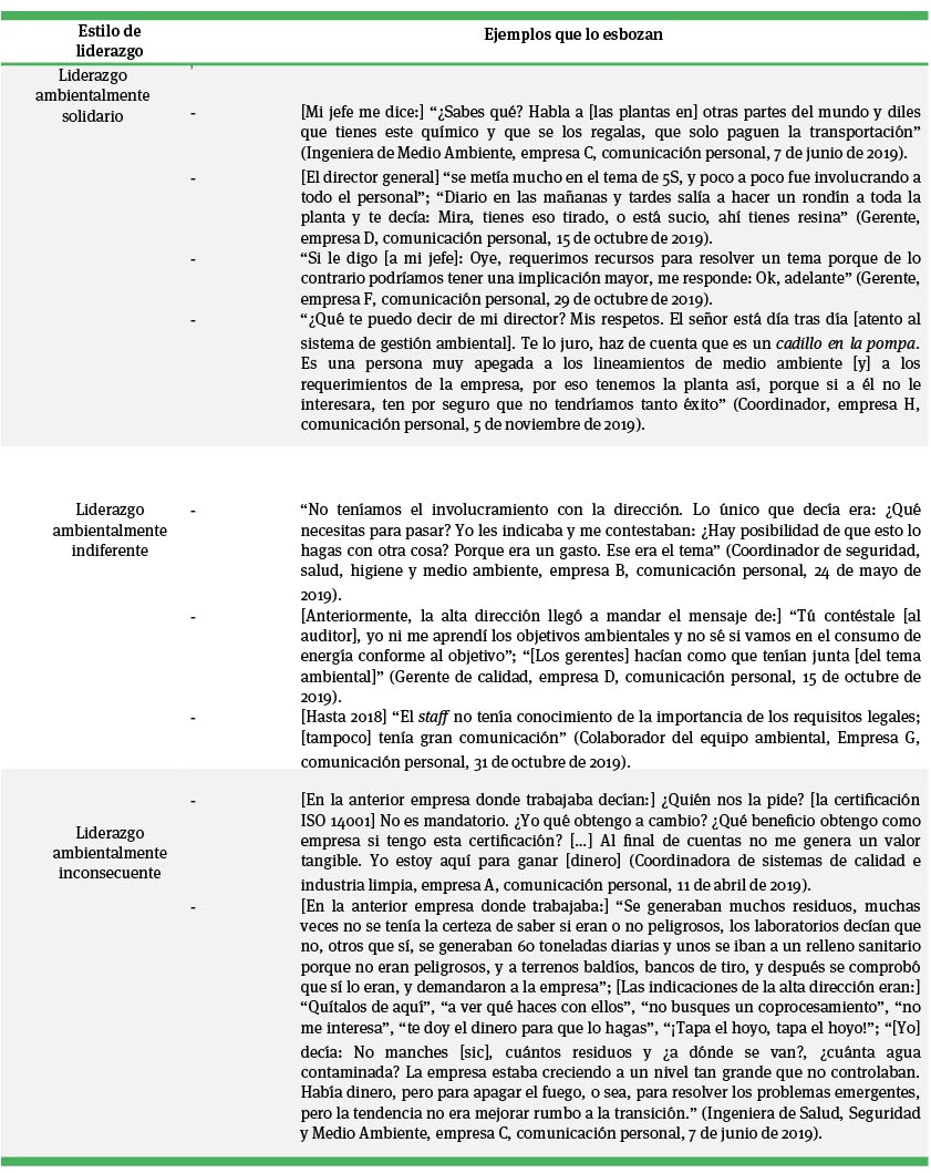 Como parte de los elementos desplegados a partir del trabajo empírico, emergieron ciertas relaciones particulares e intensas entre las estructuras ya mencionadas (mercado, corporativos, leyes y casas certificadoras), la subjetividad de ciertos actores (responsables ambientales y sus jefes de la alta dirección) y las acciones (tareas ambientales) que ellos ejecutaban (o no) dentro del vínculo jerárquico jefes-subordinados, propio de cada organización. Estas relaciones intensas de liderazgo (personales, conceptuales, históricas, organizacionales, etcétera) se agrupan, en esta configuración local, en tres estilos (constelaciones específicas) que no solo se diferencian entre sí, sino también respecto a los que son descritos por la literatura especializada (gran parte anglosajona, como se ha revisado); aquí los llamaremos liderazgo ambientalmente solidario, liderazgo ambientalmente indiferente y liderazgo ambientalmente inconsecuente.