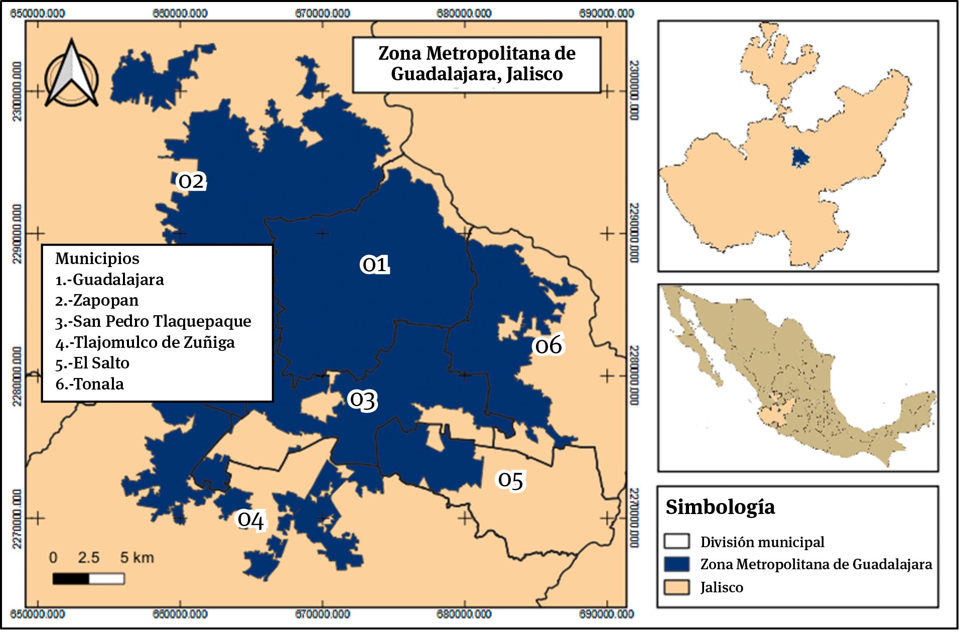 La Zona Metropolitana de Guadalajara (zmg) se localiza en el estado de Jalisco, México y comprende los municipios de Guadalajara, Zapopan, San Pedro Tlaquepaque, Tonalá, El Salto y Tlajomulco de Zuñiga (figura 1) (20°40.0092′ N y 103°23.5092′ O). La zmg tiene una superficie de 2734.1 km2, con un clima predominante del tipo semicálido semihúmedo. La temperatura media anual es de 21.7°C y tiene una precipitación media anual de 998 mm (Instituto de Información Estadística y Geográfica, 2018)