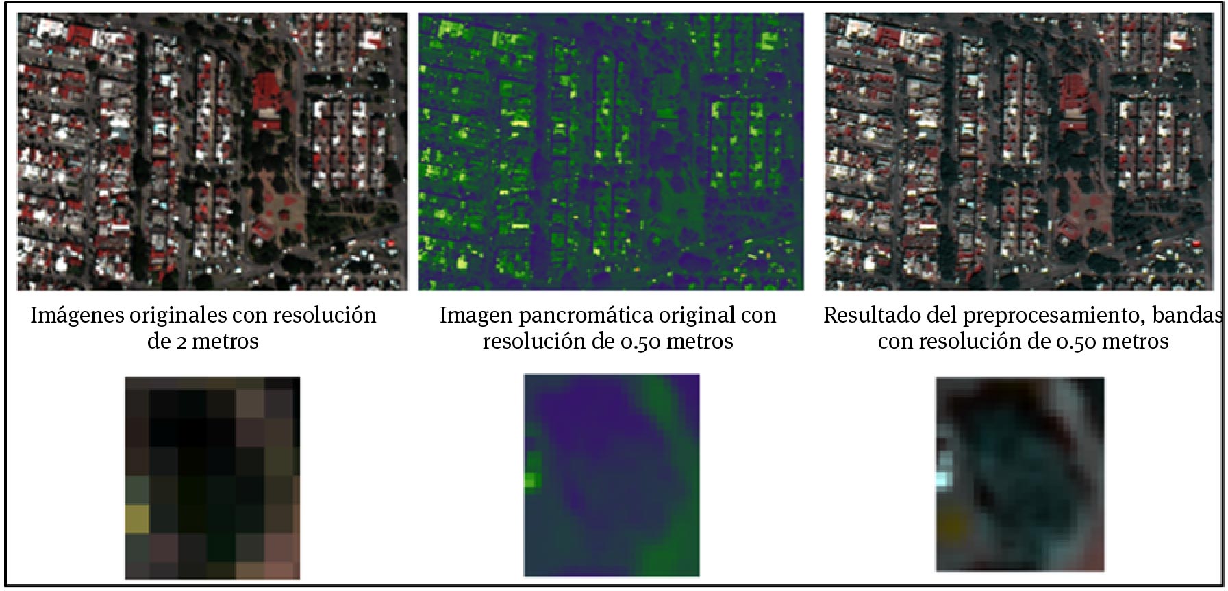 Las imágenes utilizadas fueron previamente ortorectificadas por el proveedor. A partir del formato inicial se realizó un ajuste radiométrico con el programa Idrisi versión 18.21, utilizando los parámetros para el propósito definido por DigitalGlobe (Kuester, 2017). Posteriormente, se aplicó el proceso pansharpen para incrementar la resolución de las imágenes multiespectrales con el método Intensity Hiu Saturation [hiu por sus siglas en inglés] (figura 2) (Berila y Isufi, 2021; Li et al., 2022).