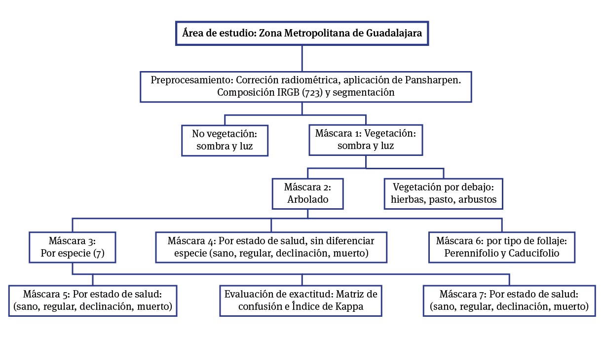 Los bosques urbanos proveen una serie de beneficios ecosistémicos en favor de la calidad de vida de los citadinos, como la reducción del efecto de isla de calor y de la contaminación atmosférica, infiltración de agua de lluvia, reducción de la escorrentía, ahorro de energía eléctrica, así como la generación de sentimientos de bienestar entre la población (Bravo-Bello et al., 2020). Particularmente, las zonas metropolitanas requieren un manejo apropiado de sus áreas verdes urbanas ya que contribuye a mitigar efectos nocivos de la urbanización en la población y fungen como un entorno para diversas actividades al aire libre. Sin embargo, el costo de monitoreo y evaluación de áreas verdes representa retos logísticos y de presupuesto en las ciudades grandes del país. En este sentido, es necesario el desarrollo de métodos fáciles de replicar y de bajo costo. Por lo tanto, la presente investigación tuvo como objetivo principal evaluar el estado de salud del arbolado de la Zona Metropolitana de Guadalajara a través de imágenes multiespectrales WorldView-2 y, de manera particular, establecer las bases para el desarrollo de métodos basados en sensores remotos para este fin.