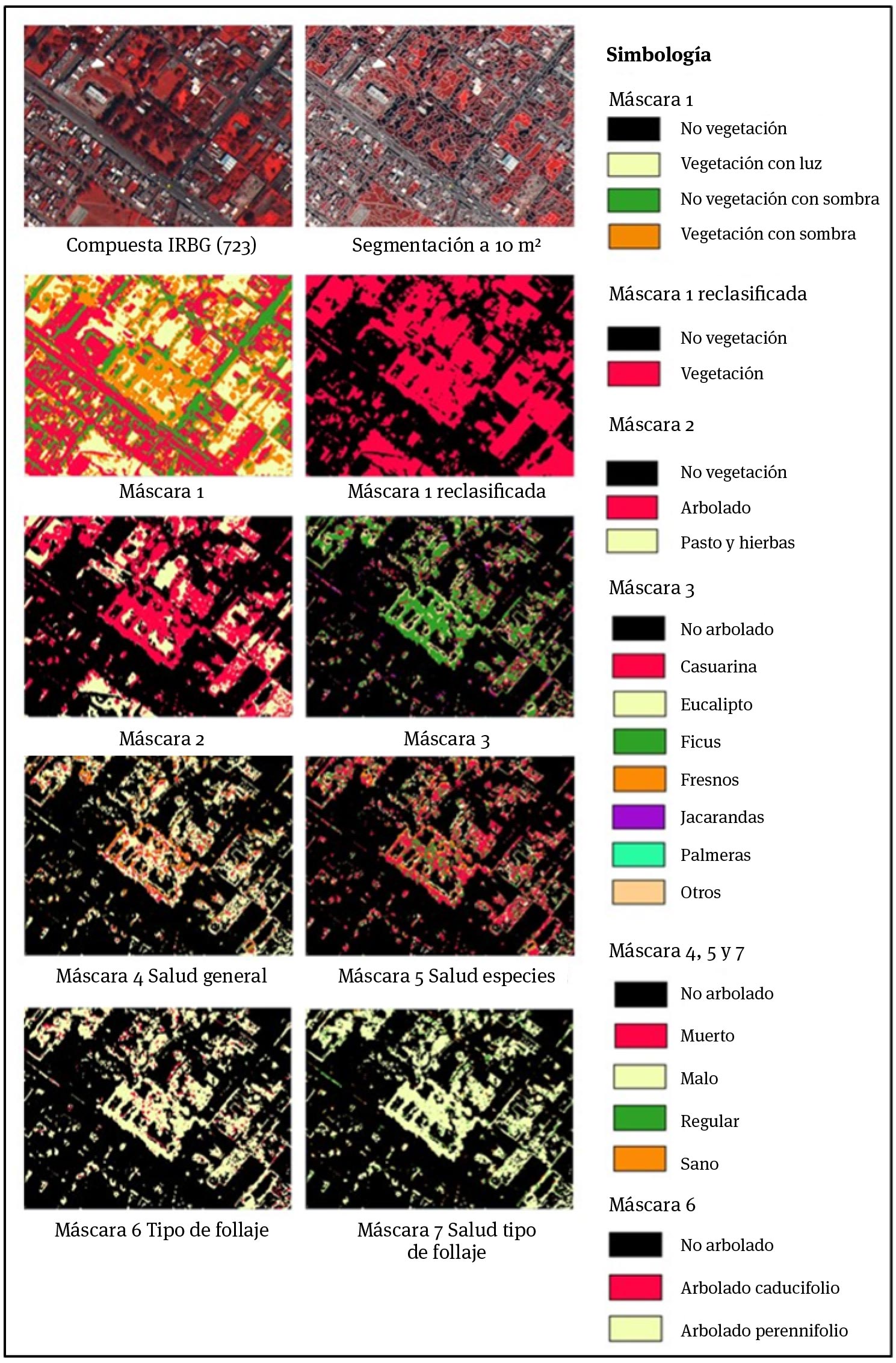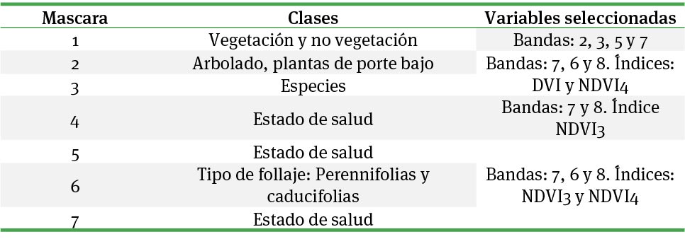 En el primer enmascaramiento se clasificó la imagen en vegetación con sombra, vegetación con luz, no vegetación con sombra y no vegetación con luz, y se eliminaron las coberturas de no vegetación; para ello se utilizaron las imágenes compuestas irbg y rbg. En la segunda mascara se utilizaron los índices de vegetación, con los cuales se clasificaron zonas de arbolado y se eliminaron las zonas de vegetación de bajo porte, como: arbustos, hierbas y pasto (Bravo-Bello et al., 2020; Zhou et al., 2021). Cabe destacar que, tanto para la primera como para la segunda mascara de clasificación, se utilizaron los sitios de entrenamiento seleccionados a partir de la herramienta SegTrain del software Idrisi versión 18.21. A partir de la tercera mascara se utilizaron como sitios de entrenamiento polígonos con radio de tres metros generados a partir del arbolado medido y se compararon los valores de cada una de las bandas y de los índices, seleccionando las variables que visiblemente señalaban una diferenciación más significativa entre clases. En la tercera mascara se clasificaron siete categorías: 1) casuarina (Casuarina equisetifolia), 2) eucalipto (Eucalyptus camaldulensis), 3) ficus (Ficus benjamina), 4) fresno (Fraxinus uhdei), 5) jacaranda (Jacaranda mimosifolia), 6) palmera (Syagrus romanzoffiana) y (Washingtonia robusta) y 7) otros, dentro del cual se incluyeron individuos de las especies aguacate (Persea americana), árbol de las orquídeas (Bahuinia variegata), grevilea (Grevilea robusta), guayabo (Psidium guajava), majahua (Hibiscus elatus), mango (Mangifera indica) y tabachín (Delonix regia).