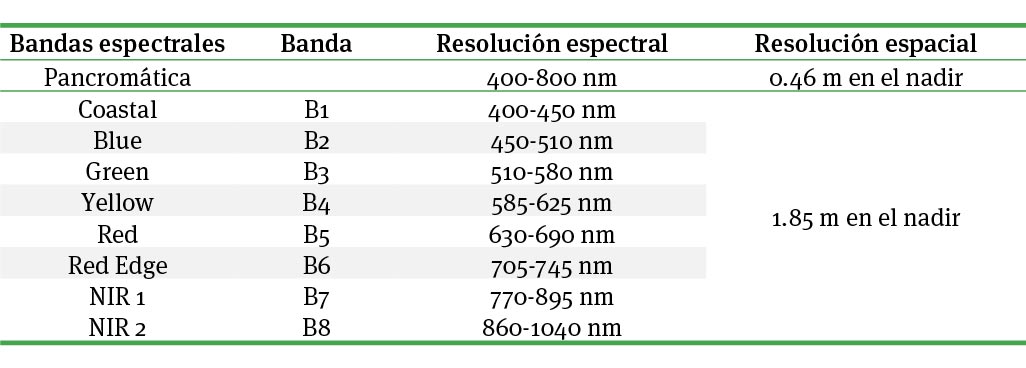 Las imágenes WorldView-2 utilizadas en el estudio fueron tomadas el 16 de octubre de 2017, tienen una resolución espacial de 0.46 m en la banda pancromática y 1.85 m en las bandas espectrales (cuadro 1). Cubren una superficie de aproximadamente 65 976.33 ha.