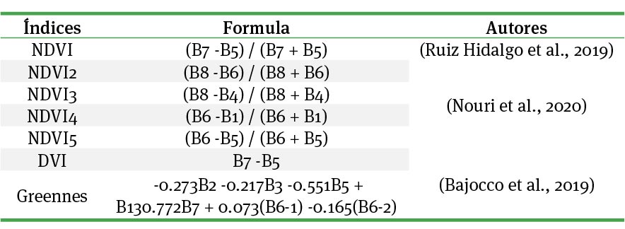 Los índices de vegetación son combinaciones de las bandas espectrales registradas en el sensor del satélite y están diseñados para resaltar una propiedad específica de las masas arboladas (Xulu et al., 2019). Los índices de vegetación utilizados en el presente estudio se calcularon con las herramientas del programa Idrisi versión 18.21 (cuadro 2) y fueron seleccionados partir de estudios previos (Pontius et al., 2017).