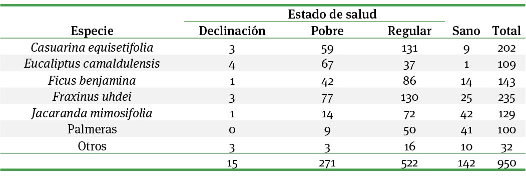 Se evaluaron 950 árboles en total, entre ellos las principales especies registradas fueron: fresno (Fraxinus uhdei Wenz.), eucalipto (Eucalyptus camaldulensis Dehnh.), ficus (Ficus benjamina L.), casuarina (Casuarina equisetifolia L.), palmera de cocos plumosa (Syagrus romanzoffiana Cham.), palmera washingtonia (Washingtonia robusta Wendl.) y jacaranda (Jacaranda mimosifolia D. Don.) (cuadro 3).