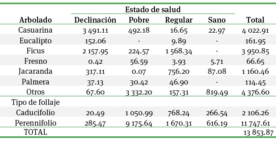 Results: Ash trees and jacarandas are among the species that were identified with a healthy condition. The highest precision for health condition (33%) was obtained through classification by type of foliage. It was estimated that only 24% of the trees evaluated in 13 854 ha have a healthy or regular condition.