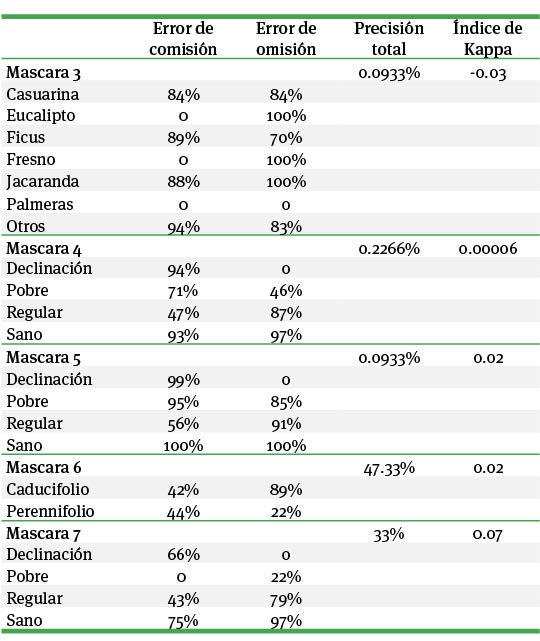 El método de clasificación de la salud del arbolado que obtuvo mayor exactitud total fue el de la clasificación por tipo de follaje con 33%, seguido del método de clasificación de salud sin diferenciación de especies con 22.66% (cuadro 6). El método que tuvo menor precisión fue la clasificación de salud por especies con 9%.