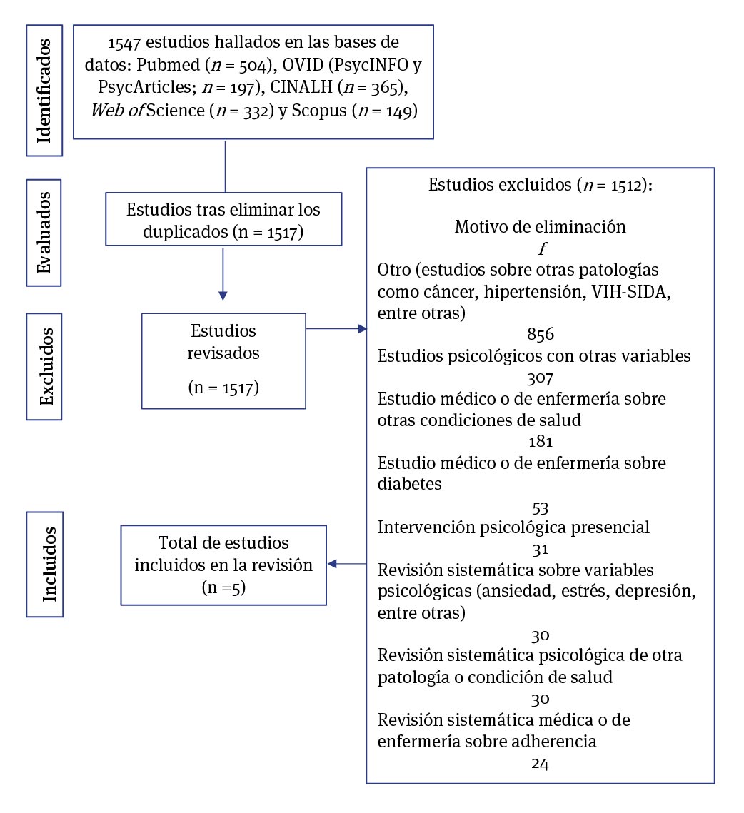 En total se encontraron 1,547 artículos, 1,542 fueron eliminados debido a: repetición en las bases de datos (n = 30), abordar otras patologías diferentes a la dm o por tratarse de otro tipo de estudio (obesidad, cáncer, hipertensión, VIH-SIDA, propuestas de intervención; n = 856), ser estudios psicológicos con otras variables y que no se haya considerado la dm (trastornos mentales, de la conducta alimentaria, etcétera; n = 307), ser estudios médicos o de enfermería sobre enfermedades crónicas diferentes a la diabetes (n = 181), ser estudios médicos o de enfermería sobre diabetes (n= 53), intervenciones psicológicas en modalidad presencial con otras variables de estudio (trastornos mentales y calidad de vida; n = 31), revisiones sistemáticas sobre variables psicológicas (ansiedad, estrés, depresión, entre otras; n = 30), revisiones sistemáticas psicológicas de otra patología o condición de salud (n = 30) y revisiones sistemáticas médicas o de enfermería sobre adherencia terapéutica (n = 24). Cinco estudios publicados entre 2011 y 2019 cumplieron con los criterios de inclusión (ver figura 1).