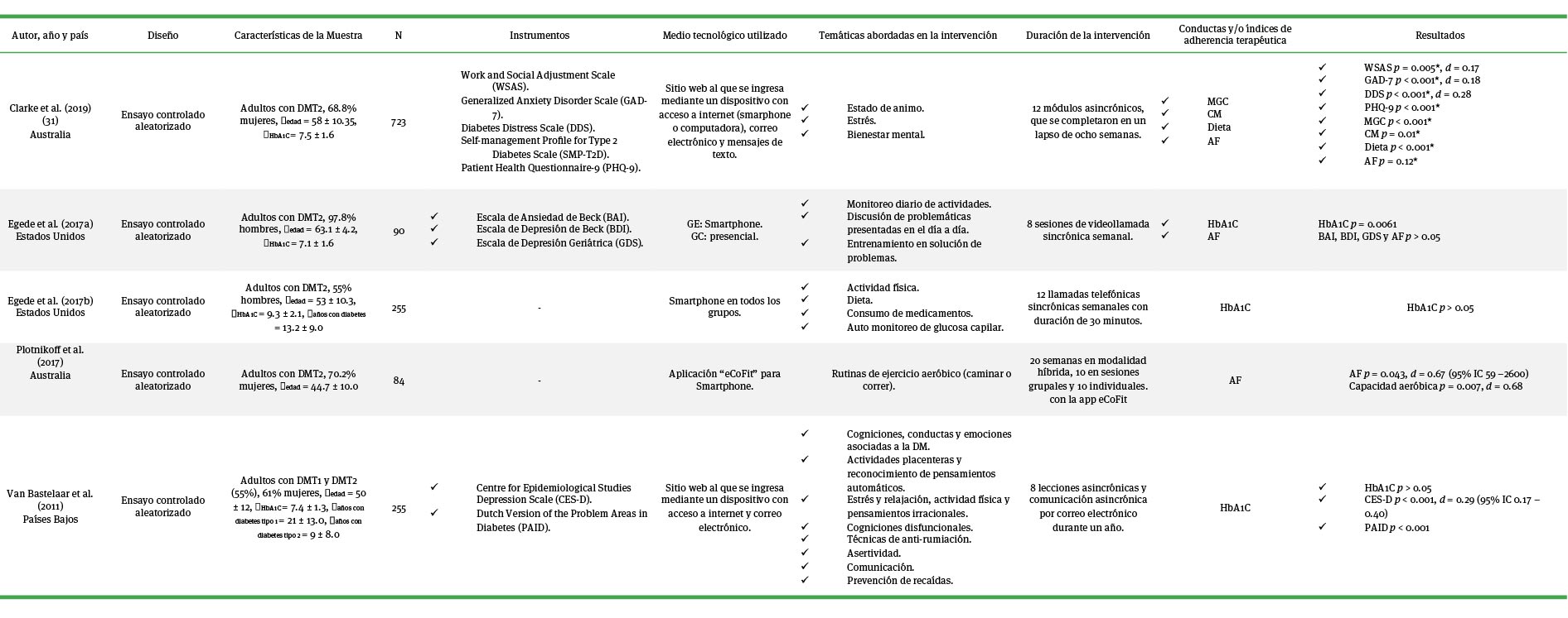 Instrumentos. En tres de los cinco estudios identificados se emplearon escalas psicométricas para evaluar los cambios sobre las variables dependientes, los cuales estaban validados y adaptados al país en el que se realizó estudio (Clarke et al., 2019; Egede et al., 2017a; Van-Bastelaar et al., 2011). La Self-Management Profile for Type 2 Diabetes Scale (smp-t2d) fue la única escala empleada para evaluar comportamientos de adherencia terapéutica (monitoreo de glucosa capilar, consumo de medicamentos, dieta y actividad física) en personas con dm, empleada en la investigación de Clarke et al. (2019). En dos estudios se emplearon escalas psicométricas adaptadas a personas con dmt2 (Clarke et al., 2017; Van-Bastelaar et al., 2011), el resto utilizaron escalas validadas en muestras comunitarias.