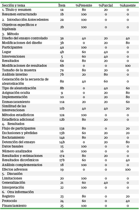 Características metodológicas de los estudios. Todos los artículos encontrados en las bases de datos fueron eca, lo que permitió evaluar su calidad metodológica considerando los 25 criterios que propone la declaración Consort, en la tabla 3 se presentan los porcentajes obtenidos del análisis. Se observa que 80% de los estudios detallan en el título de la investigación que la asignación de los sujetos fue aleatoria. Además, todos poseen un resumen estructurado (con un objetivo, método, resultados y conclusiones), en sus antecedentes citan revisiones sistemáticas y metaanálisis como evidencia empírica de estudios previos, y su objetivo o hipótesis es claro y congruente con sus hallazgos.