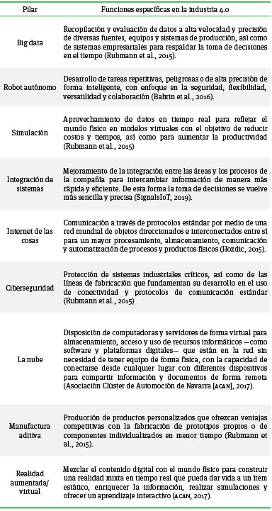 Al mismo tiempo, la automatización en los procesos de fabricación alcanzó otros niveles mediante la introducción de tecnologías flexibles de producción en masa, donde la maquinaria se convirtió en una entidad independiente que no requiere de la aportación y supervisión humana (Kagermann, 2013). Dichas tecnologías fueron representadas por 9 pilares (los cuales se muestran en la tabla 1) con funciones específicas que mejoraron los procesos productivos, optimizaron los recursos disponibles y, en algunos casos, perfeccionaron y/o reemplazaron la acción humana.