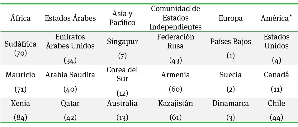 En este último punto, el Foro Económico Mundial, a través del Network Readiness Index [nri] (Portulans Institute, 2021), proporciona un marco metodológico por medio de cuatro pilares (tecnología, personas, gobernanza e impacto) que reconoce las aplicaciones y avances en tecnología digital de 130 economías nacionales. En el informe de 2021 describe cómo la tecnología y las personas necesitan integrarse en una gobernanza eficaz para tener el impacto adecuado en la economía, sociedad y medio ambiente, reconociendo que a pesar de que la tecnología digital está cambiando nuestras vidas de una forma vertiginosa todavía existen brechas de acceso a ella en diversa regiones y economías en el mundo. A pesar de ello, tanto las economías emergentes como las desarrolladas han mostrado iniciativa para reducir la brecha digital y promover un acceso más equitativo. Estados Unidos y Corea del Sur han mostrado liderazgo para promover la conectividad a través de iniciativas como internet satelital y 5G. China es ahora un líder mundial en áreas clave como inteligencia artificial, comercio electrónico, 5G y calidad de la educación. África sigue a la zaga de otras regiones, especialmente en lo que respecta al acceso, la asequibilidad y el uso de las tecnologías digitales. El nri 2021 también confirma que las economías desarrolladas en Europa, parte de Asia y el Pacífico y América del Norte son las sociedades más preparadas en tecnologías digitales. Prueba de ello es la tabla 2, donde se muestran los 3 líderes por cada región con su respectiva posición en el ranking global (Portulans Institute, 2021).