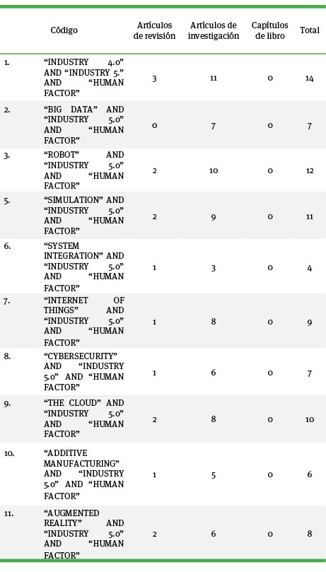 Posteriormente, se relacionó cada pilar de la industria 4.0 con la industria 5.0 y el factor humano a través de los siguientes códigos: “BIG DATA” AND “INDUSTRY 5.0” AND “HUMAN FACTOR”, “ROBOT” AND “INDUSTRY 5.0” AND “HUMAN FACTOR”, “SIMULATION” AND “INDUSTRY 5.0” AND “HUMAN FACTOR”, “SYSTEM INTEGRATION” AND “INDUSTRY 5.0” AND “HUMAN FACTOR”, “INTERNET OF THINGS” AND “INDUSTRY 5.0” AND “HUMAN FACTOR”, “CYBERSECURITY” AND “INDUSTRY 5.0” AND “HUMAN FACTOR”, “THE CLOUD” AND “INDUSTRY 5.0” AND “HUMAN FACTOR”, “ADDITIVE MANUFACTURING” AND “INDUSTRY 5.0” AND “HUMAN FACTOR” y “AUGMENTED REALITY” AND “INDUSTRY 5.0” AND “HUMAN FACTOR”.