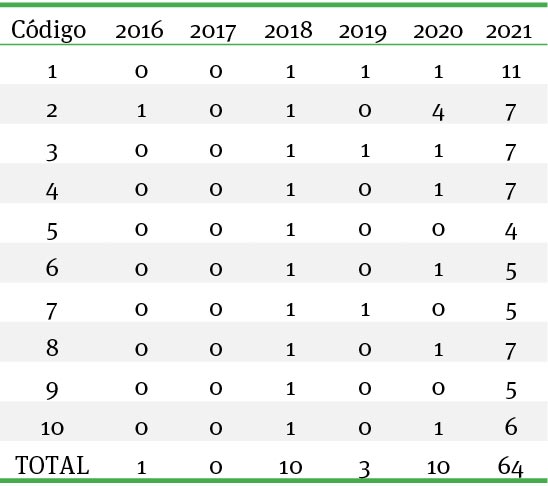 En la tabla 4 se muestra cuántos trabajos fueron publicados por año con base en cada código establecido.