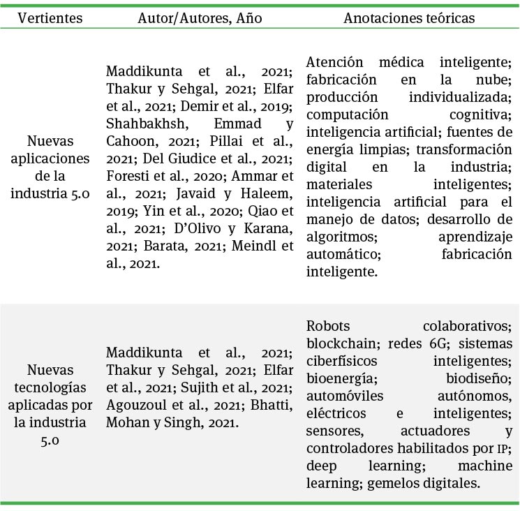 La revisión sistemática de la literatura mostró que los trabajos analizados se enfocan principalmente en dos vertientes: nuevas aplicaciones y nuevas tecnologías. Las anotaciones teóricas más relevantes de estos trabajos de investigación se presentan en la tabla 5.