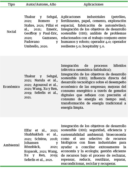 El sector industrial ha experimentado una creciente influencia por incorporar la sustentabilidad dentro de su contexto y cultura empresarial, siendo la implementación en sus procesos uno de sus principales retos (Niehoff y Beier, 2018). Por ello, dentro del contexto, en la tabla 6 se identificaron las aplicaciones más relevantes en materia de desarrollo sustentable en sus dimensiones social (beneficios para la sociedad y su entorno), económica (inversión verde) y ambiental (prevención de la contaminación y gestión de recursos naturales).
