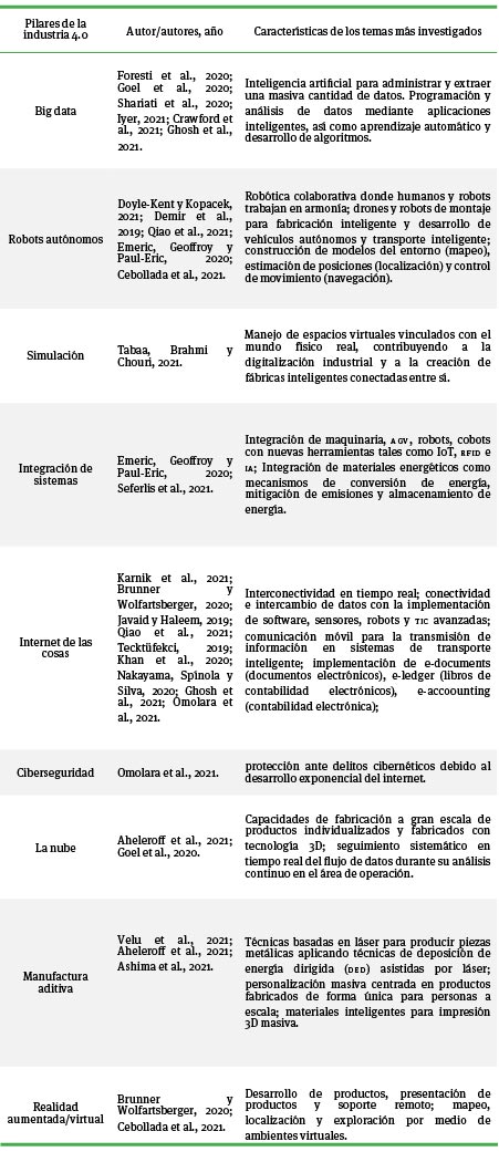 De cara al futuro, diversas investigaciones consideran a la industria 5.0 como la siguiente revolución industrial (Maddikunta et al., 2021; Thakur y Sehgal, 2021; Shahbakhsh et al., 2021). Por lo que en esta sección se identificaron las características de los temas más investigados sobre cada uno de los pilares de la industria 4.0, para así poder determinar los campos de aplicación que podrían ser requeridos en el futuro, tal como se muestra en la tabla 7.