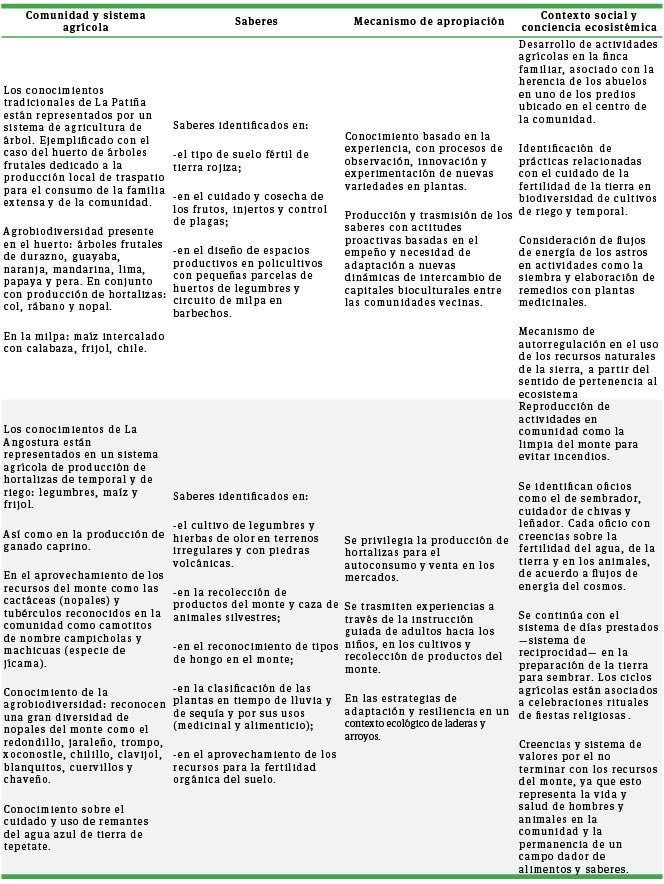 Hallazgos: se concluye que los saberes locales tradicionales permiten la continuidad de una conciencia ecosistema expresada en un modo de vida local basado en la familia campesina y un sistema de reciprocidad con el medioambiente en el cuidado de los recursos naturales dentro de una región con pocos esfuerzos encaminados a procesos de transición agroecológica.