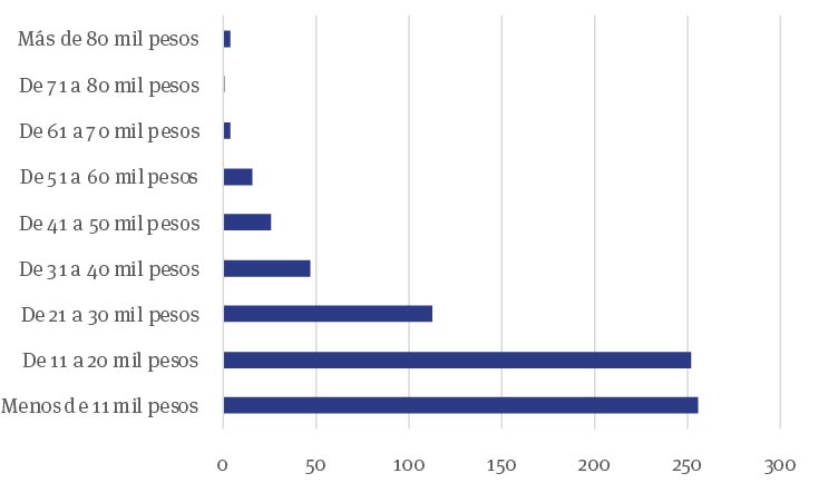 El levantamiento de la información fue llevado a cabo durante los meses de septiembre y octubre de 2021, se hizo de forma virtual dado que se desarrolló durante el período de confinamiento ocasionado por la pandemia de COVID-19. Debido a una baja tasa de respuesta de las encuestas virtuales se recurrió a los métodos de muestreo por disponibilidad, juicio y referenciado. La encuesta fue difundida a través de redes sociales y contactos personales de los encuestadores y fue contestada utilizando la plataforma QuestionPro. Se lograron un total de 1 137 encuestas, filtrando los cuestionarios incompletos, no respondidos y posterior a un proceso de edición y validación quedaron las 719 encuestas que integraron la muestra. Debido al método de muestreo, la población joven de menos de 40 años, que en la población representa 52 %, en la muestra quedó representada en 76 %. En cuanto al género, 57 % de la muestra fueron mujeres y 43 % hombres, similar a los datos encontrados en la población donde la población de mujeres es de 51 % y de hombres un 49 %. En cuanto al ingreso socioeconómico, se calcula que en la ciudad de Mérida, 53 % pertenece a clase media o más, y en la muestra quedó representada en 60 % (población que gana 21 mil pesos o más, ver gráfico 2), lo que resultó dentro de lo esperado considerando la zona donde estaba ubicada la muestra (los datos estadísticos fueron tomados del Censo de población y vivienda 2020 del Instituto Nacional de Estadística y Geografía [Inegi] 2020 y de la encuesta de niveles socioeconómicos de la Asociación Mexicana de Agencias de Investigación de Mercado [amai] (2020), ambas páginas consultadas el 11 de agosto de 2022).