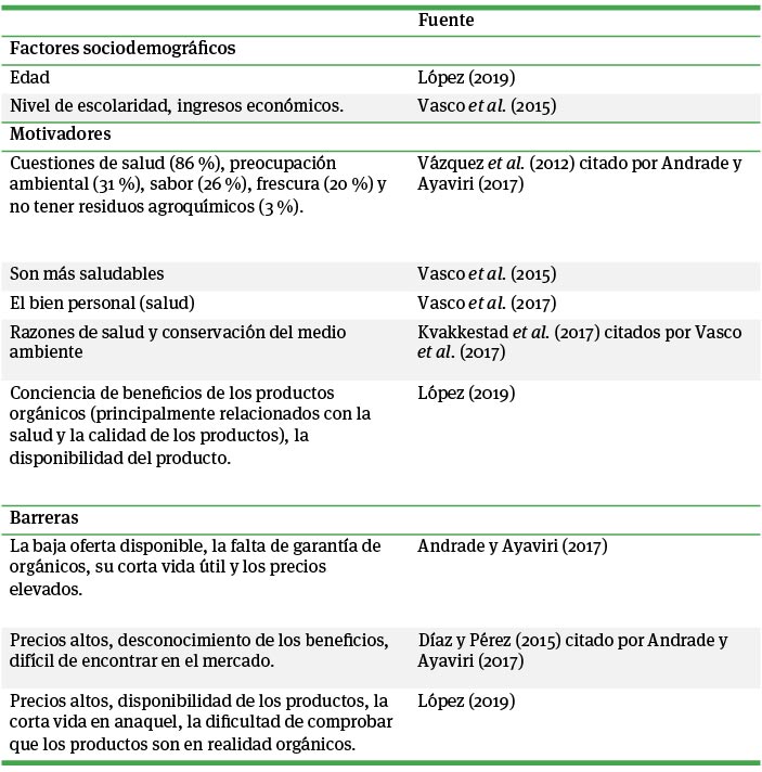 En la tabla 1 se presenta un resumen de los estudios que se consideraron relevantes de acuerdo con su contribución y similitud con el mercado mexicano con respecto a los principales factores sociodemográficos, motivadores y barreras que inciden en la compra de productos orgánicos o agroecológicos.