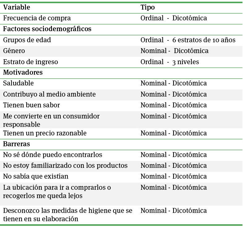 Además del grupo de edad, el género y el nivel de ingresos como factores sociodemográficos; los motivadores y las barreras que se consideraron para llevar a cabo este estudio fueron seleccionados a partir del marco teórico y de los resultados del estudio descriptivo de la frecuencia de compra, considerando los cinco principales motivadores y las cinco principales barreras, según la percepción de los encuestados.