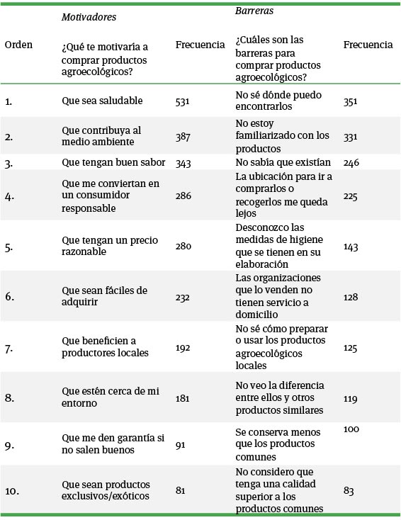 Los principales motivadores y barreras para comprar productos agroecológicos, según la percepción de los clientes potenciales, se presentan en la tabla 3 (en orden de mayor a menor importancia según el número de veces que los clientes potenciales los seleccionaron).
