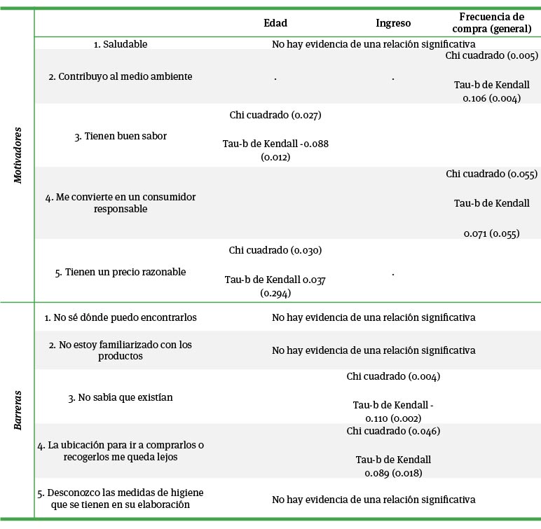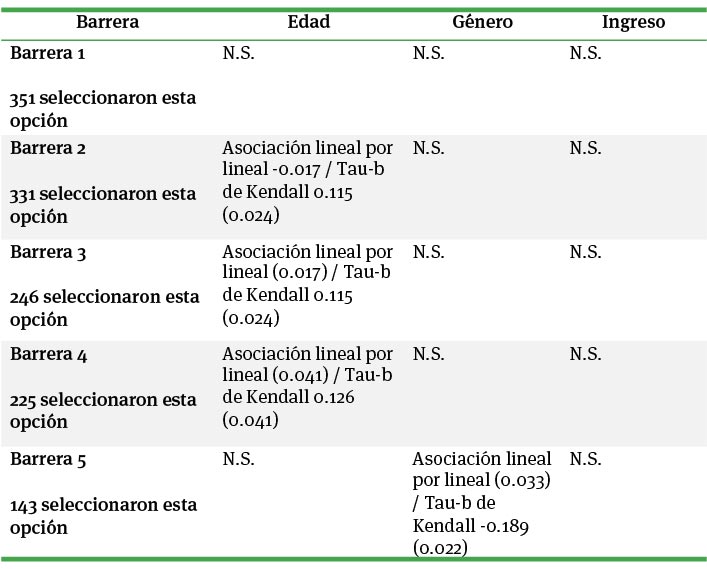 En la tabla 6 se presentan los resultados de las relaciones que se analizaron por cada factor sociodemográfico, cada motivador y cada barrera, teniendo como resultado lo siguiente:
