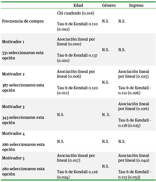 No se encontraron relaciones significativas entre el género y los diferentes motivadores. Incluso entre el género y la frecuencia de compra, tampoco se encontraron relaciones significativas (por lo que no se representó en la tabla)