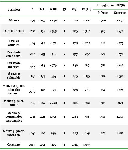 Por otro lado, se construyó el modelo de regresión logística binaria, con relación a la compra frecuente de los productos agroecológicos de comercio justo, utilizando las variables de los factores sociodemográficos, los motivadores y las barreras comentadas anteriormente.