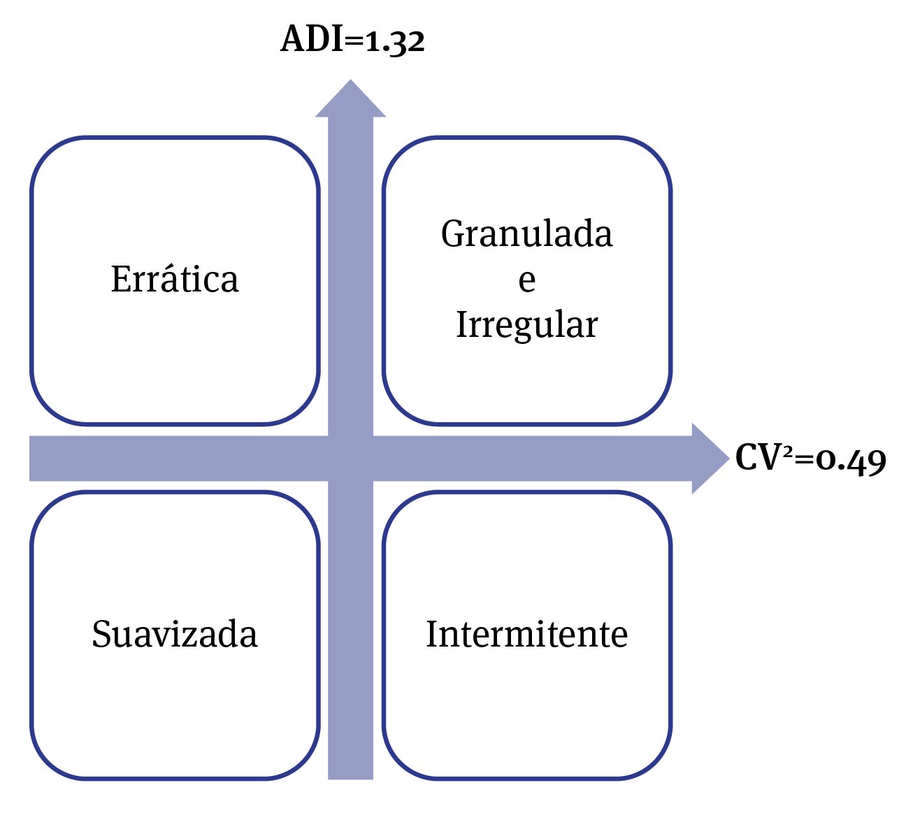 Los valores de corte para la clasificación de patrones sugeridos por Syntetos et al. (2005) son ADI=1.32 y . En la figura 1 se muestran las categorías de demanda propuestas.