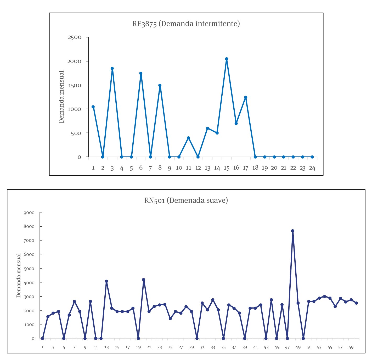 Señalando los diferentes criterios de categorización propuestos por Syntetos et al. (2005) y del análisis resultante a las 3 empresas de autopartes, la tabla 4 expone que los sku de 1N solo presentan categorías erráticas y suaves, con 29.03% y 70.97% respectivamente. Esto indica que la mayor parte de los componentes mantienen una baja variabilidad de la demanda y los periodos entre dos demandas no nulas también son bajos. En tanto los productos de 1E quedan categorizados en irregular con 25%, suavizada con 12.50% e intermitente con 62.50%, demostrando que la mayor parte de los datos de demanda muestran varios valores nulos, además de dos series con alta variabilidad en sus tamaños de demanda y entre los periodos de demandas no nulas. La figura 2 ejemplifica lo explicado anteriormente, con dos gráficos correspondientes tanto a la parte nacional (RN501), como a la de exportación (RE3875).