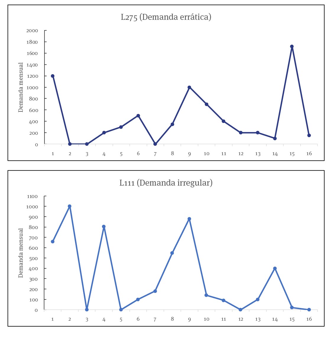 Los patrones de demanda intermitente se caracterizan por demandas poco frecuentes, a menudo de tamaño variable, que se producen a intervalos irregulares (Syntetos et al., 2012).
