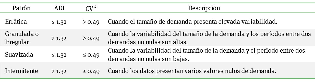 Cada término de la ecuación 2 es utilizado para seleccionar el tipo de patrón de la demanda. Los patrones propuestos son: esporádico, movimiento lento y suave. Williams (1984) propone valores de corte entre cada categoría cuando el tiempo de entrega es constante y el número de pedidos que llegan se comportan de acuerdo con una distribución de Poisson, sin embargo, menciona que la elección de los límites entre categorías es una decisión administrativa dependiente del sector y tipo de artículo. En su trabajo Eaves y Kingsman (2004), amplían las categorías de los patrones de demanda de Williams (1984) a: suave, irregular, movimiento lento e intermitente, este último, lo dividen en ligera y altamente intermitente. Dicha modificación la realizan estableciendo el límite para la variabilidad de las transacciones en el cuartil inferior, mientras que los límites para la variabilidad del tamaño de la demanda y la variabilidad del tiempo de entrega se establecen en sus respectivas medianas.