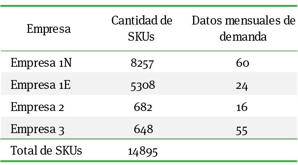 Los datos utilizados en el presente estudio son demandas mensuales de tres empresas de autopartes mexicanas, ubicadas en el Estado de México; enfocadas al ensamble y venta de autopartes a nivel nacional e internacional y consideradas medianas empresas por la Secretaría de Economía. La tabla 2 presenta un resumen de la cantidad de datos de demanda proporcionados en cada empresa y el número de skus por cada una, (la empresa 1N y 1E son la misma, sin embargo, la empresa maneja un control separado de skus nacionales (1N) y de exportación (1E), que las otras dos empresas no hacen).