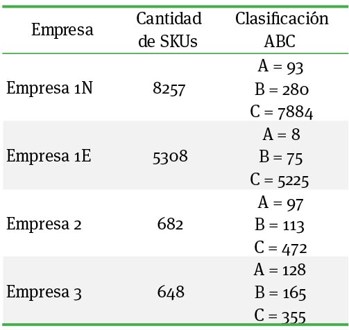 La tabla 3 muestra los resultados de la clasificación ABC de cada empresa, de los 14 895 skus, solo 326 pertenecen al grupo A, representado así 80% de sus volúmenes de demanda y ventas.