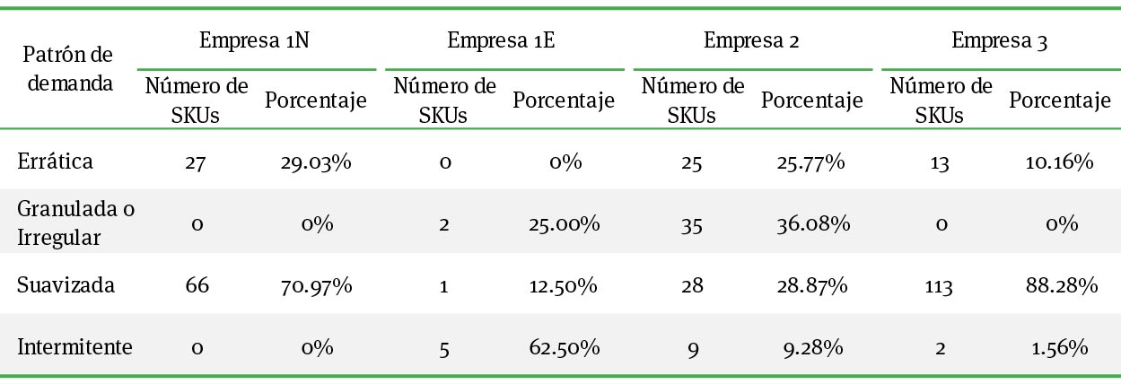 Resultados: el análisis probabilístico de la demanda de los 14 895 productos, muestra patrones de demanda suavizados (63.80%), erráticos (19.94%), irregulares (11.35%) e intermitentes (4.91%), de lo cual se concluye que los patrones de demanda para estas empresas son principalmente de tipo suavizado.
