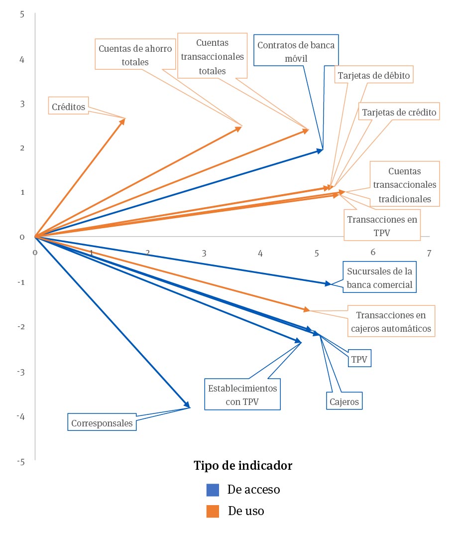 De acuerdo con los datos del cuadro 2 y con la figura 3, que muestra el HJ-biplot de los indicadores de inclusión financiera del año 2019, la primera componente principal está definida por los indicadores transacciones en tpv (5.49), cuentas transaccionales tradicionales (5.57) y sucursales de la banca comercial (5.25), de los cuales dos son de uso y uno de acceso. Por otra parte, el segundo eje está definido por cuentas de ahorro totales (3.25) y corresponsales (-4.04) (un indicador de uso y uno de acceso).