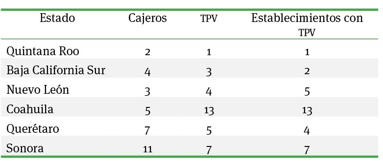 En el Panorama de la Inclusión Financiera 2021 (cnbv, 2021) se reportan algunos cambios en ciertos indicadores de inclusión financiera analizando sus valores en los años 2019 y 2020. Sólo se menciona brevemente que estos cambios están relacionados con la pandemia de Covid-19. Por ejemplo, se señala un acelerado crecimiento en el número de pagos mediante terminales punto de venta [tpv]. También se mencionan aumentos en el número de transacciones y en transferencias electrónicas, corresponsales, cajeros, cuentas de ahorro para el retiro y cuentas de captación. De igual forma, se reporta una disminución en el número de créditos para personas y en el número de sucursales (cnbv, 2021). Para revelar los estados más destacados y los menos favorecidos respecto a la inclusión financiera, en este reporte se muestran los cinco estados con los mayores valores y los cinco estados con los menores valores de los indicadores analizados. Sin embargo, no se proporciona información más detallada a nivel estatal.