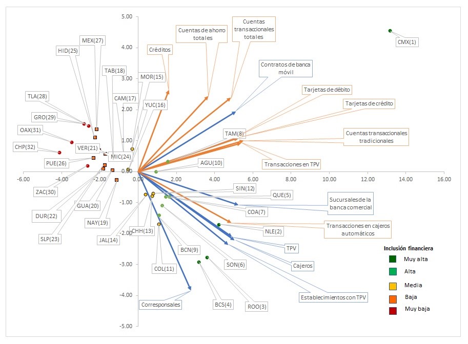 La mayor parte de los estados están ubicados en los cuadrantes II y IV, mientras que solo hay un estado en el cuadrante I (Ciudad de México) y dos en el cuadrante III (Nayarit y Yucatán). Esto indica que las características de inclusión financiera son heterogéneas en el conjunto de las entidades federativas de México, pero se pueden distinguir dos grupos principales y algunos casos especiales. Además, los estados que están representados por puntos cercanos entre sí tuvieron características similares de inclusión financiera, de acuerdo con los indicadores analizados. Un ejemplo de esto son Hidalgo (26), Ciudad de México (27) y Tlaxcala (28), que además fueron clasificados por Banamex con el mismo nivel de inclusión financiera y en posiciones consecutivas en el mencionado índice.