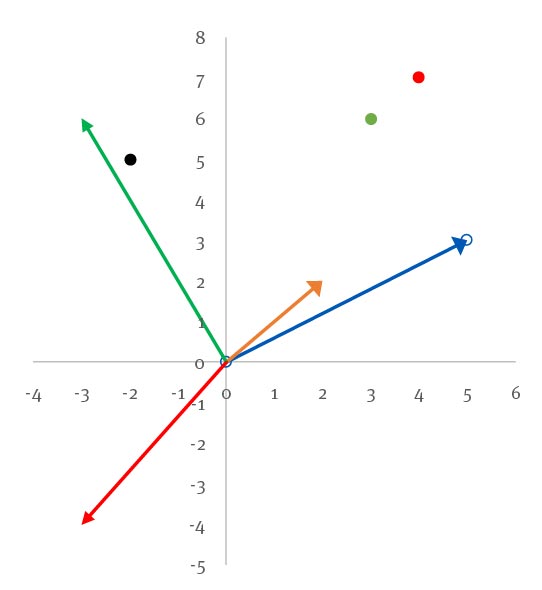 En el HJ-biplot, el coeficiente de correlación de Pearson de dos variables es aproximadamente igual al coseno del ángulo formado entre las flechas que las representan, mientras que la distancia de Mahalanobis entre dos individuos es la distancia entre los puntos que los representan. En la figura 1 se muestran algunas flechas y puntos en un HJ-biplot. El ángulo entre las flechas azul y naranja es cercano a 0o, lo que indica que el coeficiente de correlación de Pearson que les corresponde es cercano a , es decir, tienen una correlación positiva alta. En cambio, el ángulo entre las flechas azul y roja es cercano a 180o y su coeficiente de correlación de Pearson es cercano a , por lo que la correlación entre ellas es negativa. Entre las flechas azul y verde el ángulo es aproximadamente de 90o y su coeficiente de correlación de Pearson es cercano a , es decir, son independientes estas variables. Por otra parte, los puntos rojo y verde están cercanos entre sí, lo que indica que su distancia de Mahalanobis es pequeña y, por lo tanto, tienen valores similares en las variables analizadas. Por otro lado, la distancia entre los puntos rojo y negro es mayor y por eso tiene mayores diferencias entre sus valores en las variables consideradas.