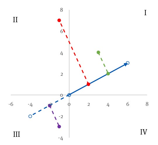Nota: La flecha representa una variable y los puntos fuera de la línea de la flecha representan individuos. Los puntos en la flecha definen la componente de cada individuo respecto a la variable representada. Los números romanos indican la numeración de los cuadrantes.