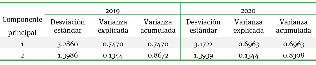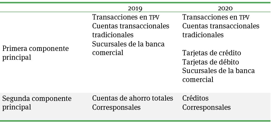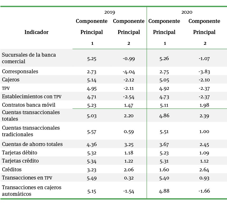 En el cuadro 2 se muestra la contribución relativa de cada indicador a la inclusión financiera en los años 2019 y 2020, lo que hace posible saber cuáles de ellos definen a las dos primeras componentes principales en cada año.
