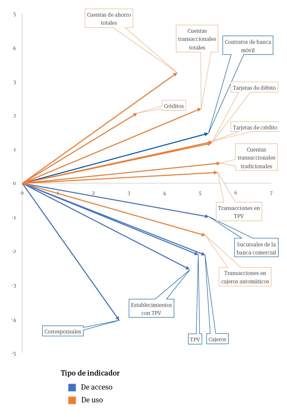 Por otra parte, los indicadores corresponsales y cuentas de ahorro totales tienen una correlación cercana a 0 porque el ángulo entre sus flechas es aproximadamente 90⁰. En este caso, estos indicadores son independientes entre sí. El coeficiente de correlación de Pearson correspondiente es de -.072.