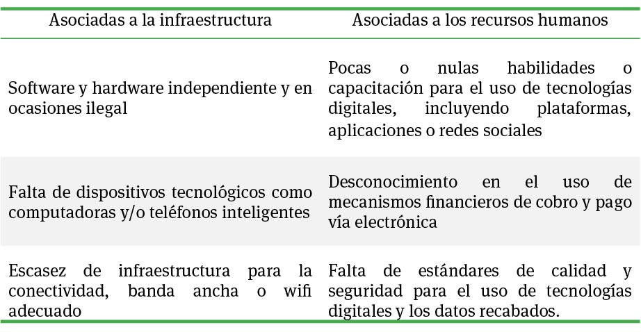 De manera que la pandemia por la Covid-19 representó una amenaza y, en algunos casos, una oportunidad para transitar al uso de herramientas digitales para sobrevivir. Vale la pena destacar que, en efecto, las Mipymes ya se encontraban frente a la necesidad de adaptarse y cambiar ante los requerimientos del paradigma de la Industria 4.0, pero la pandemia aceleró dicha problemática. Algunas de las barreras que las Mipymes enfrentan en relación con la transformación tecnológica y digital se resumen en la tabla 1.