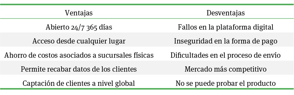 Como se ha mencionado, conforme la tecnología avanza, la sociedad enfrenta una diversidad de retos en su desarrollo, adquisición, uso, explotación, adaptabilidad, etcétera. En el ámbito empresarial, el proceso de digitalización puede integrarse en distintas etapas de la cadena de valor y lo que se observa es que, en particular para las Mipymes, es en el proceso de comercialización donde se ubica el mayor despliegue. Pero al mismo tiempo, las empresas se ven frente al reto que conlleva la aplicación de un canal en línea, ya que requieren elementos técnicos y humanos que les permitan aprovechar las plataformas digitales existentes. Al respecto, en la tabla 2 se presentan algunas ventajas y desventajas del comercio en línea que las Mipymes tienen que considerar al incursionar en el contexto de venta digital.